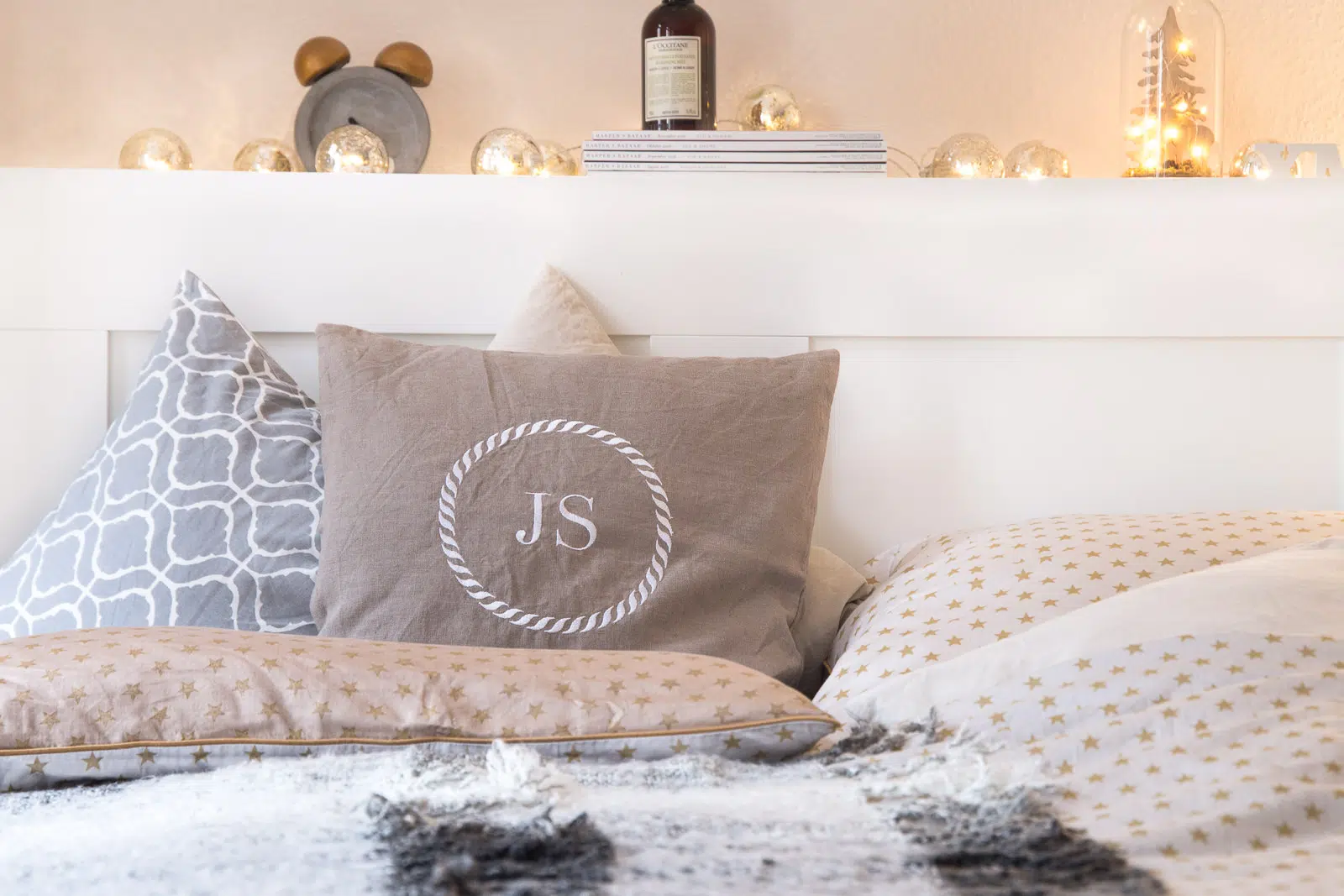 Der erste Schritt zu einem gemütlichen Schlafzimmer: Viele Kissen und Decken. Manch einer schüttelt bei der Masse an Kissen in meinem Bett den Kopf. Ich liebe es aber. Wahrscheinlich könnt ich mit Kissen bedecken oder Prinzessin auf der Erbse spielen, aber es einfach so schön kuschelig. Vor Kurzem habe ich mir bei Dormando* neue Bettwäsche für den Winter ausgesucht. Ich muss zugeben, dass ich tatsächlich viel Bettwäsche habe und im Winter immer andere Stoffe und Texturen nutze. Diese süße Sternchen-Bettwäsche ist aus Mako-Satin und glänzt ganz leicht. Hier findet ihr weitere Winter Bettwäsche mit schönen Prints. Die Baumwolle ist schön glatt und perfekt für den Winter. Aktuell ist die Bettwäsche leider nicht mehr lieferbar, aber vielleicht änder sich das wieder. Es gibt sie auch noch in anderen Farben. Meine kleinen Kissenbezüge und die Wolldecke sind übrigens von H&M Home. Ihr seht deutlich, ich ziehe das Farbkonzept in allen Facetten durch.